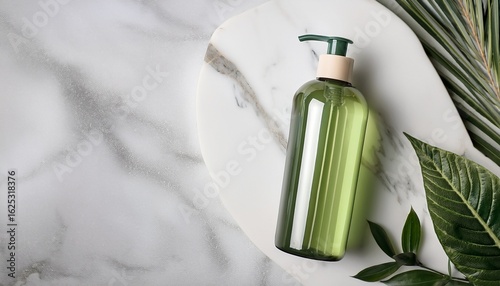 herbal shampoo bottle with natural elements on marble background for elegant skincare packaging