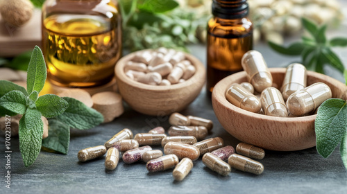 Herbal supplements and essential oils displayed on a table Generative AI