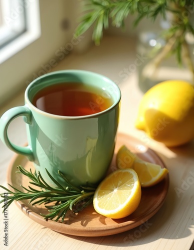 Herbal tea composition. Green mug of tea with lemon slices, rosemary sprig. Wooden plate and table, soft light. Healthy beverage for wellness, relaxation, detox or immunity boost in cold season.