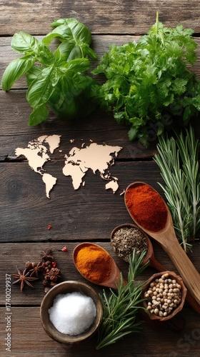 Herbs and spices arranged on a wooden surface with a world map silhouette in a vibrant cooking setup
