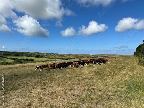 Herd of cows in a field on a sunny day in Cornwall, UK