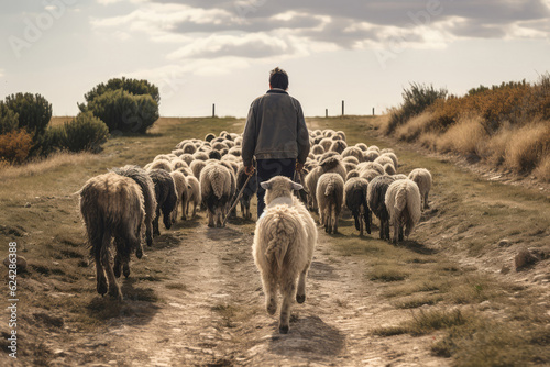 Herd Of Sheep Being Guided By Shepherd. Generative AI