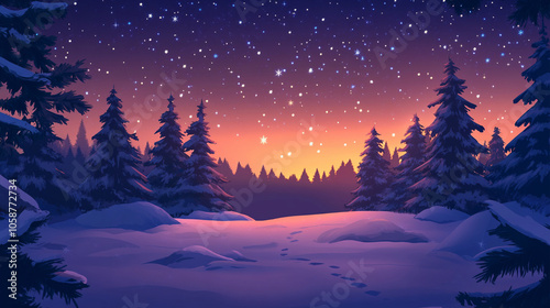 Hermoso paisaje nocturno invernal con árboles nevados, cielo estrellado y espacio para texto. Este fondo invernal es ideal para diseñar tarjetas navideñas o invitaciones para fiestas de Año Nuevo.