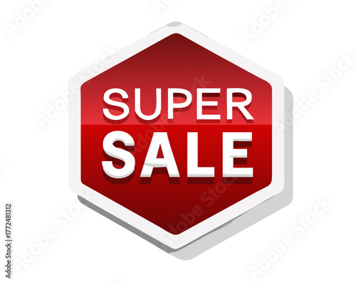 Hexagonal red sale label with super sale white text, 3d glossy badge, vector discount sticker for promotion