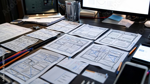 High angle view of a desk with multiple wireframe sketches and digital tools for creating a content management system