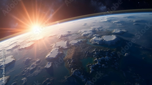 High Orbit Earth View at Sunrise, Polar Caps Visible, Milky Way Behind