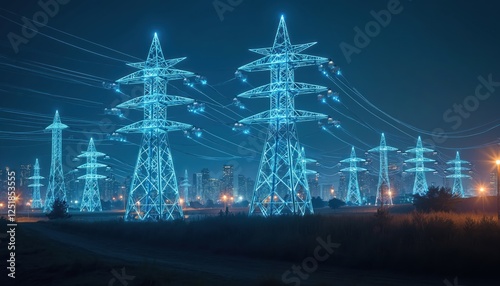 High power electricity pylon towers with cables in urban area, connect to smart grid. Energy supply, distribution, transmission concept. High voltage supply at night with horizon city landscape, blue
