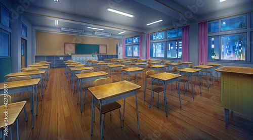 High school classroom in the nighttime and Turn on the light, Anime background, 2D illustration.