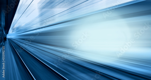 High speed train runs on rail tracks . Train in motion