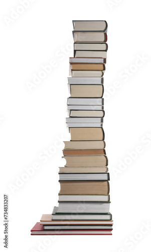 High stack of many different books isolated on white