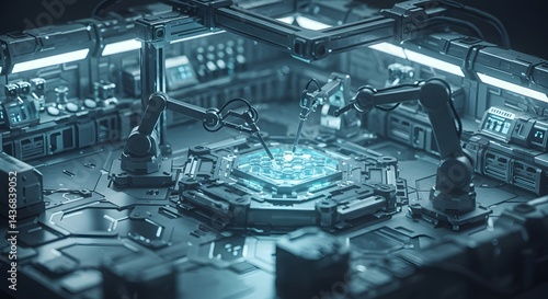 High tech robotic assembly line for microchips and computer processors futuristic factory setting