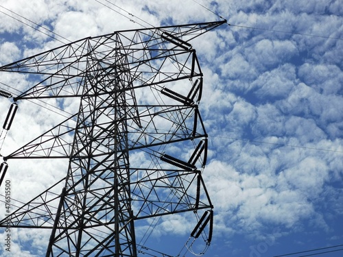 High voltage transmission tower against blue sky with clouds.