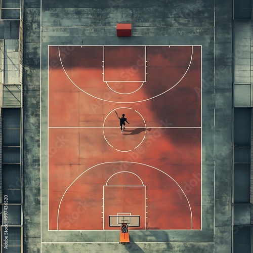High-altitude shot of a lone player practicing on a sunlit basketball court