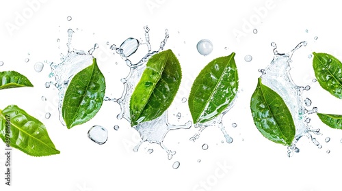 High-Definition Photograph of Green Tea Leaves with Dewdrops for the Beauty Industry