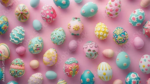 Highly decorated pastel coloured easter eggs on a pale pink background.