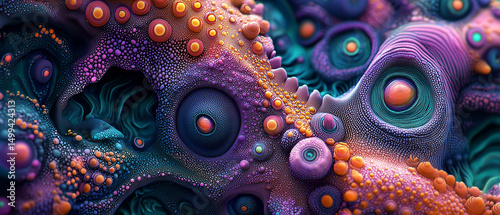 Highly detailed fantasy surface with raised bubble-like orange and violet nodules, resembling a surreal biological system or alien coral, perfect for futuristic biotech art, textures