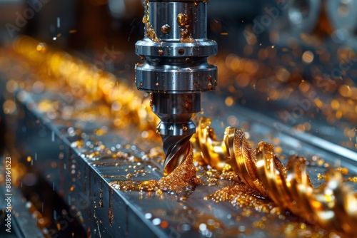 Highly detailed image of CNC drilling process with intense orange sparks and metal shavings