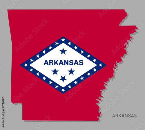 Highly detailed map of Arkansas with flag inside. AR USA State map with territory borders, political or geographical design realistic vector illustration on gray background