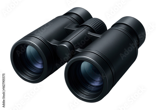 High-quality black binoculars with ergonomic design and textured focus wheel on transparent background.