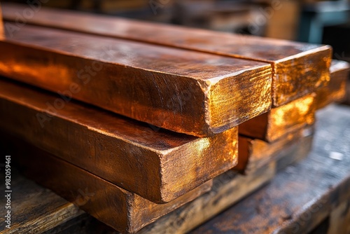 High-quality Copper Bars Stacked in a Workshop, Showcasing Their Shiny Surface and Precise Shape
