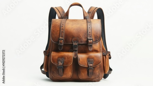 High-quality leather backpack with padded straps, side pockets, and a simple yet elegant design, isolate on white background