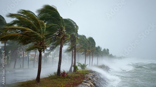 High-quality photo of strong gale causes palm trees to lean, tropical cyclone, and typhoon in the tropics.