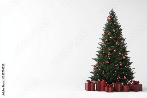 High-resolution photo of decorated Christmas tree with gifts underneath, clean white background and copyspace, festive and elegant styling