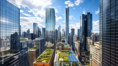 High-rise cityscape with green rooftops and solar panels under a bright sunny sky.