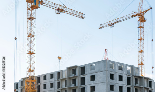 High-rise construction cranes work on construction sites