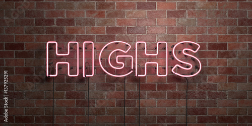 HIGHS - fluorescent Neon tube Sign on brickwork - Front view - 3D rendered royalty free stock picture. Can be used for online banner ads and direct mailers..