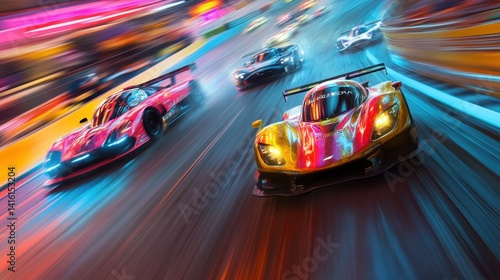 High-Speed Racing Action with Dynamic Motion Blur of Super Cars on a Night Track in Vibrant Colors