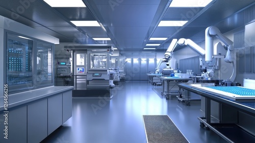 High-tech cleanroom with robotic arms and advanced machinery for pharmaceutical or microchip manufacturing.