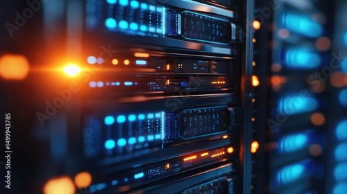 High-tech data center with illuminated server racks and glowing lights in blue and orange tones, ideal for cloud computing, cybersecurity, and digital infrastructure visuals