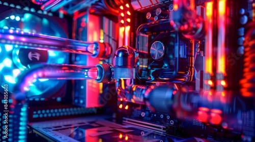 High-Tech Gaming PC with RGB Liquid Cooling System - Futuristic Hardware Setup, Close-Up, Neon Lights, and Transparent Tubes