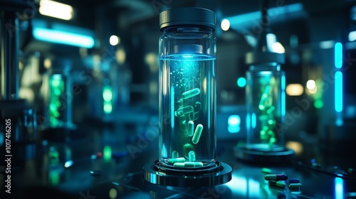 High-Tech Pharmaceutical Lab with Capsules Illuminated