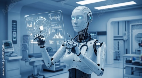 Hightech robotic practitioner evaluating health metrics on digital interface in scifi medical center.