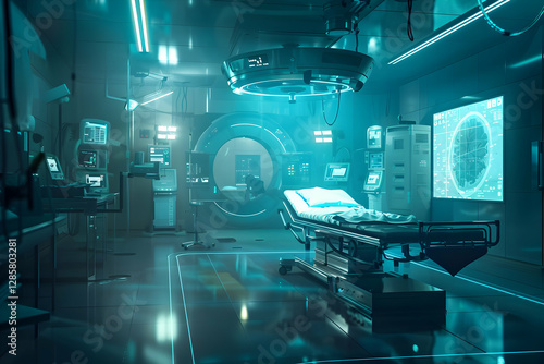 High-tech surgical room with advanced medical equipment, illuminated by blue lighting, showcasing a patient on the operating table