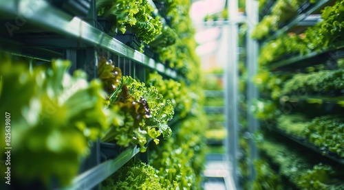 High-tech vertical farm with an array of grow shelves filled with green vegetables, representing the future of sustainable agriculture using technology for growing plants in indoor environments.