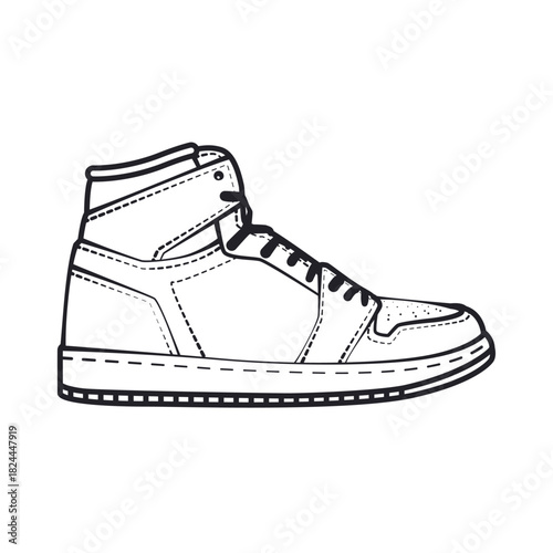 High-top sneaker line art, detailed stitching, clean outline vector, modern streetwear footwear drawing.