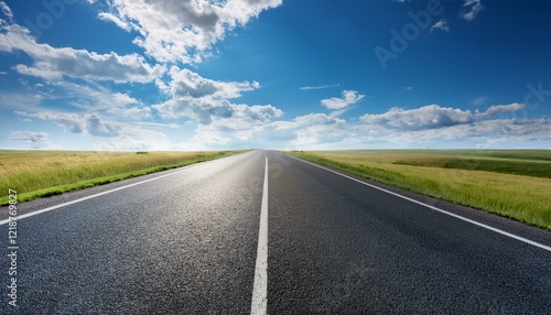 highway in the grassland background of blue sky and bright clouds long road stretches into the distance empty street on a beautiful sunny day