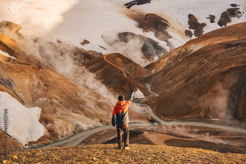 Hiker man standing at Kerlingarfjoll with volcano mountain in summer at Highlands of Iceland