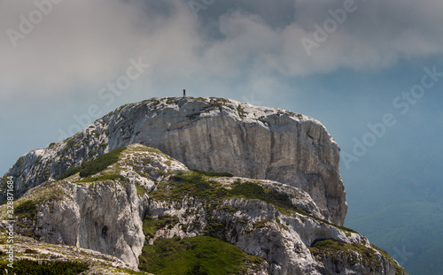 Hiker man standing on a cliff in Retezat National park in Carpathian mountain range, Romania