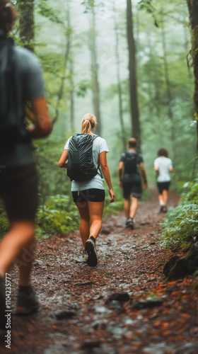 Hikers exploring a lush trail in a tropical forest during a misty morning