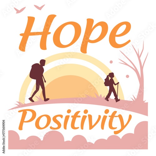 Hikers journey towards a radiant sunrise, embodying hope and positivity amidst natures beauty, with birds soaring above