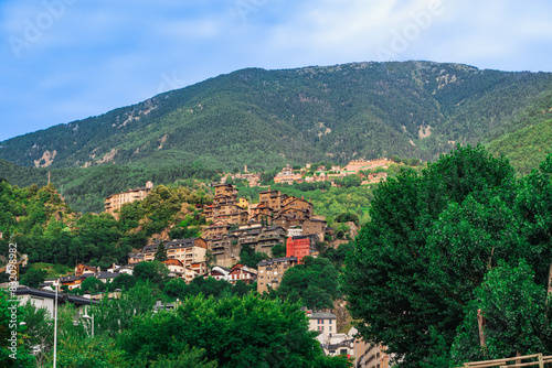 Hill houses surrounded by green vegetation in the Pyrenees mountains in the capital, Andorra la Vella, Andorra
