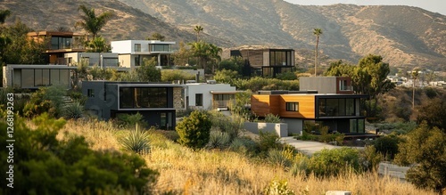 Hillside modern homes nestled amongst dry grass and palm trees, mountains in the background.