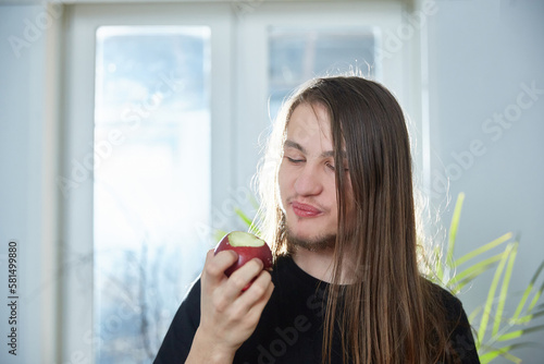 Hippie guy with long hair eats an apple at home
