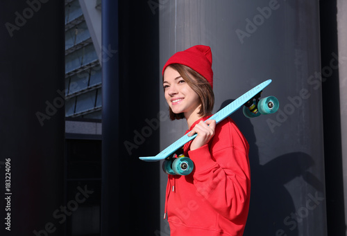 Hipster girl with skateboard outdoors