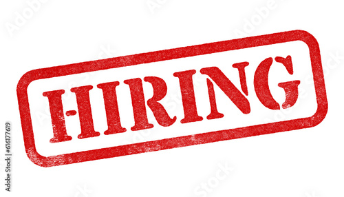 Hiring red rubber stamp isolated on transparent background with distressed texture effect