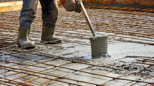 Hispanic concrete worker pouring cement into a foundation mold. Featuring cement pouring and foundation work
